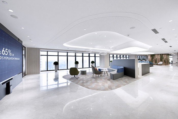 3、時(shí)尚高檔辦公樓前廳設(shè)計(jì):作為前廳,展現(xiàn)的不僅是企業(yè)的硬件形象,也是品牌的軟實(shí)力象征。地面大面積是淺灰色的天然石材,通透而潔凈;沒有傳統(tǒng)的形象墻,一片黑色石材托舉的池水位于大廳中心,背景是窗外林立的樓座和遠(yuǎn)方依稀的海灣,藍(lán)色LOGO字標(biāo)矗立在緩緩涌動(dòng)的水面之上,寧靜而又蘊(yùn)含著能量。LOGO水池與分列東、西兩側(cè)的接待臺(tái)和茶水間外墻輪廓近似,三處形體平面位置相互錯(cuò)落;高低、體量不同,材質(zhì)各異,均形如卵石;外廓曲、直結(jié)合,柔順卻有張力。地面的三塊巨大“卵石”與天花對應(yīng)燈膜“浮云”相互呼應(yīng);其間的行走動(dòng)線猶如水流,自由、平滑地漲落在“卵石”之間,猶如不遠(yuǎn)處潮起潮落的海浪;交織于前廳的樞紐功能由此得到有序的組織。