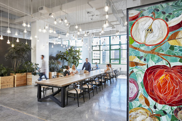 注重復(fù)古和手工藝品的Etsy總部,自然要體現(xiàn)這一獨(dú)特元素的設(shè)計(jì)和運(yùn)用,室內(nèi)大量的藝術(shù)品、裝飾品和家具都來(lái)自當(dāng)?shù)氐乃囆g(shù)家以及Etsy的網(wǎng)店賣家。入口處手工制作的大型吊燈更是令時(shí)尚辦公網(wǎng)的小伙伴們驚艷。在Etsy總部沒有華麗的材料堆砌,只有隨處可見的藝術(shù)品、墻面壁畫、充滿創(chuàng)意的手工藝品、有趣的裝飾品,還有生機(jī)勃勃的綠色植物。