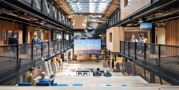 辦公室內(nèi)有29個鄰里單位,大型公共桌子取代了個人辦公桌。這些區(qū)域內(nèi)還包括了個人儲藏空間,一個或兩個高凳站立區(qū)域,以及一個沙發(fā)位。中心樓梯成為辦公室里的聚焦點(diǎn)。樓梯以“廣場”為名,把二層和地面層連接起來,使各樓層空間融為一體。多功能的樓梯能滿足多種用途,從能容納多達(dá)400人的會議和社區(qū)活動空間,到工作環(huán)境里的休息風(fēng)格空間。