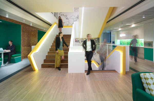 每層都配有舒適的社交空間以契合公司的品牌文化,四個(gè)樓層分別以澳大利亞優(yōu)美的環(huán)境象征來(lái)命名:景觀公園、美麗的后花園、假日海灘、夏日葡萄園。