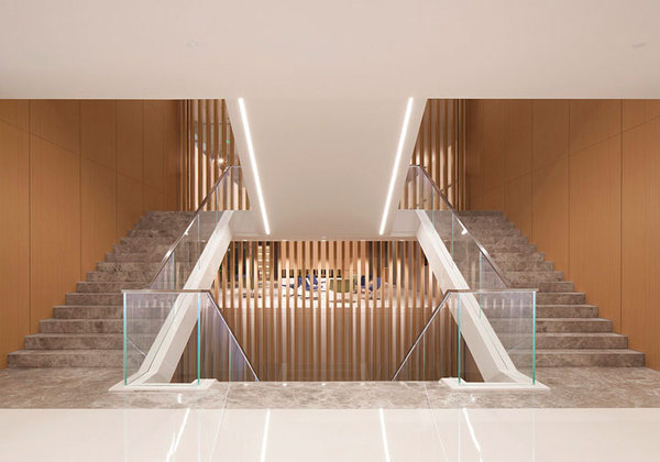 其中中間150多平面的挑空層成為貫穿上下3層辦公空間的主要樓梯通道。雙向上下滿(mǎn)足高流量需求。