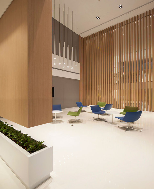 從地面延伸到天花的木色及縱向木色格柵,為員工營(yíng)造溫馨舒適的緩沖空間并可作為開(kāi)放討論區(qū)使用。