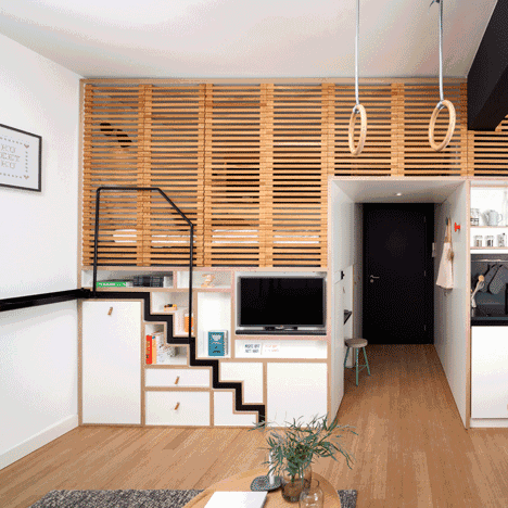 看似簡(jiǎn)潔的天花板其實(shí)是供晚上睡的床。