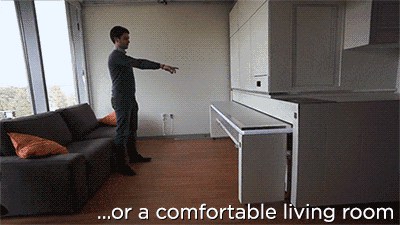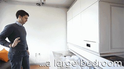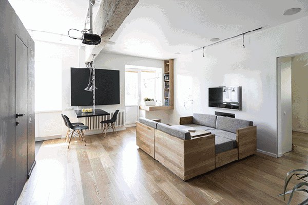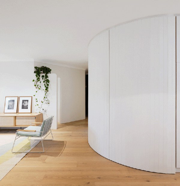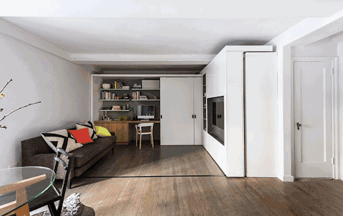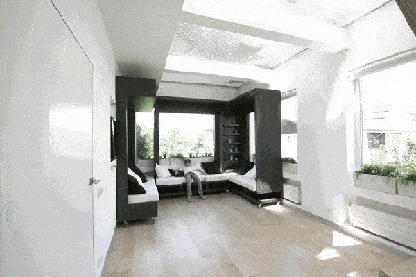 這面移動(dòng)電視墻可以將整個(gè)空間隔離成五個(gè)空間。
