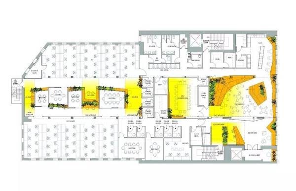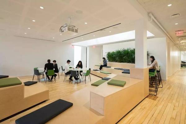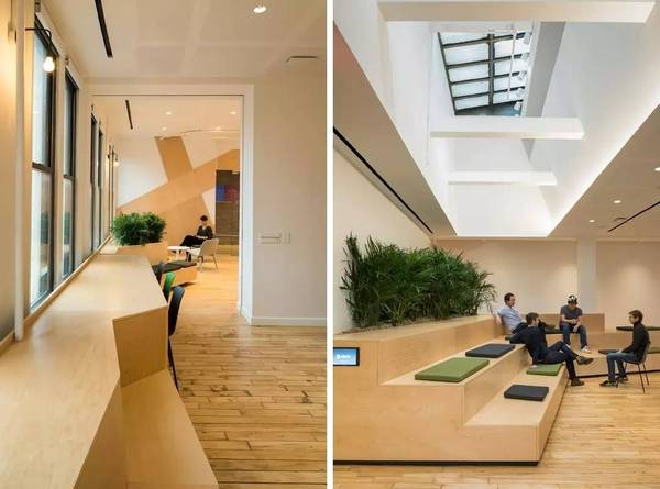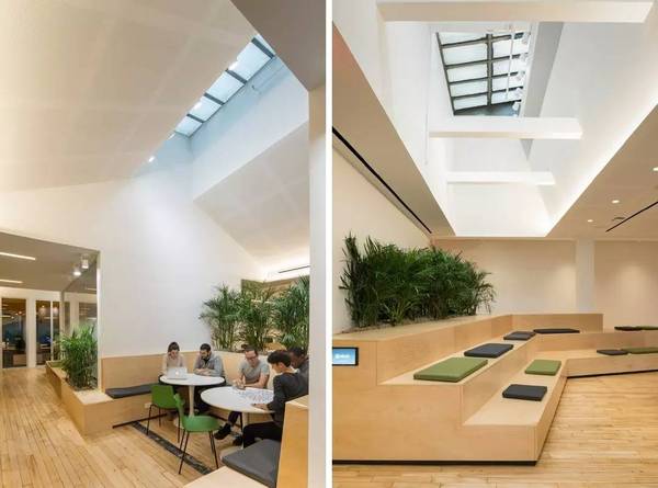 Sn?hetta對Slack新紐約空間設(shè)計的靈感來源于**特色的城市小院。從Paley Park的室內(nèi)景觀中吸取靈感,竹植物提供自然的隱私屏幕,并為綠化帶來空間。現(xiàn)有四個天窗與放大,八字天花板大大增加了室內(nèi)以及內(nèi)部小庭院的自然光線。