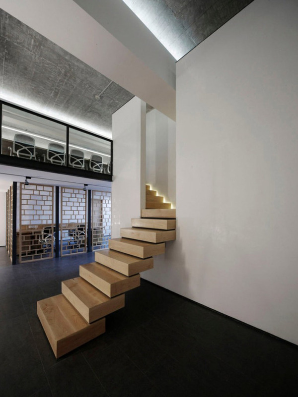 挑高的入口門廳中,地面運(yùn)用了灰色仿古磚,原本白色的天花板表皮被鏟掉,露出原有的混凝土表情,打砂的方式使天花板既達(dá)到防塵的效果,又擁有特殊的細(xì)膩肌理。門廳中央為兩道白墻,白墻中間的細(xì)縫夾著一道窄窄的無扶手樓梯。這個(gè)看似冒險(xiǎn)的設(shè)計(jì)實(shí)際上解決了屋頂建筑橫梁帶來的對閣樓人員流通的阻礙問題。