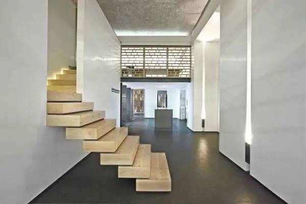 樓梯在中間往兩側(cè)分開,在高高的白墻中間,如同一道通往別處的裝置,吸引觀者登梯探訪。通過白墻和天花間露出的微光,可以看到白墻并未真正與墻接合,且邊緣用鋼條鑲嵌,展露出更鮮明挺拔的體塊形狀。為了提升空間的立體感,門廳沒有設(shè)置照明設(shè)備,唯有從遠(yuǎn)處墻壁的燈柱迎來的淡淡白光,令觀者一進(jìn)門即在這份寧靜中得到放松。