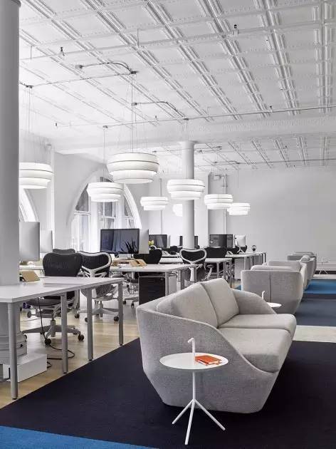 整個(gè)辦公區(qū)成L形布局,一條由藍(lán)灰相間的瓷磚鋪成的通道將員工迎入辦公區(qū),辦公區(qū)擁有*多的自然光照,同時(shí)來(lái)自于Rich Brilliant Willing公司巨大的燈具為整個(gè)辦公空間在晚間提供舒適的照明環(huán)境。會(huì)議室結(jié)合歐式與美式兩種風(fēng)格,簡(jiǎn)潔時(shí)尚的特點(diǎn),為空間增加了透明感?;疑玀oroso沙發(fā)和白色Anglepoise經(jīng)典燈具的休息區(qū),則為員工提供了舒適的飯后咖啡與休憩空間。