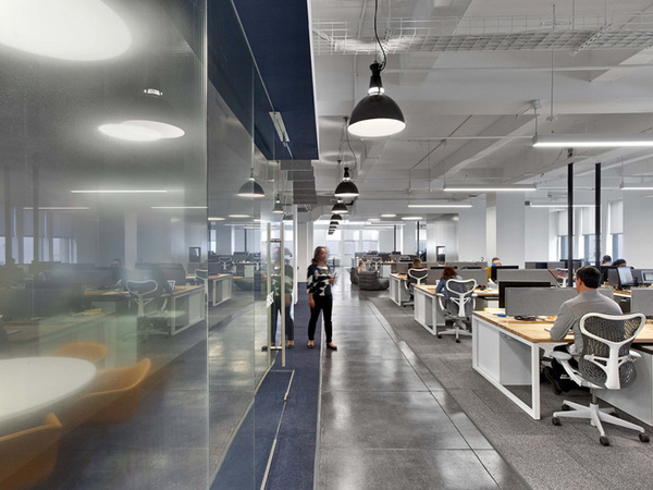 清朗凝練的空間更多了一份雍容典雅的都市氣質(zhì),依舊以藍(lán)色標(biāo)志色為裝飾主調(diào),只是這次的藍(lán)色更暗雅、更富于細(xì)膩的變化。極富質(zhì)感的白蠟?zāi)静馁|(zhì)與黑色碳鋼構(gòu)件制作的家具,呈現(xiàn)出特有的都市氣質(zhì)。閉合的洽談室和會(huì)議室大多聚集于空間的內(nèi)部,以盡可能留出沿窗的空間令視線不被遮擋。連續(xù)而開敞的玻璃窗,讓室外城市美景盡收眼底,心情也變得豁然開朗。
