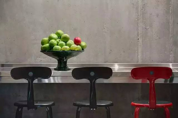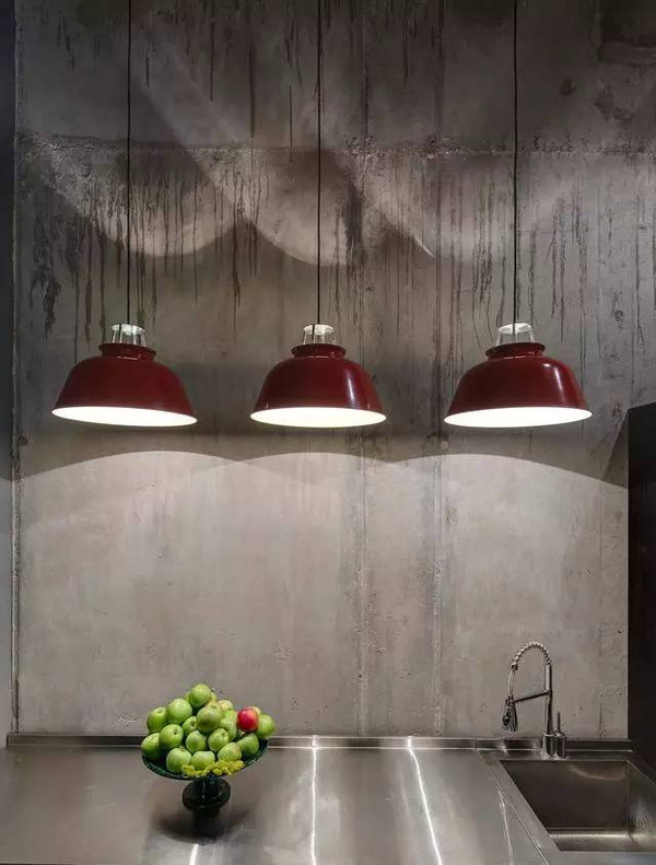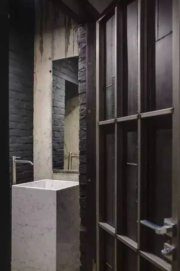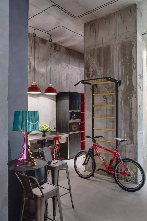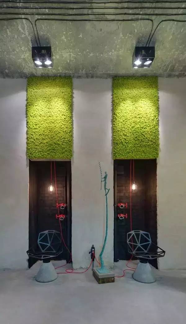裸露的水泥墻面和水管閥門,被很好的歸納起來(lái),成為了裝飾墻,綠色的塊毯成了一個(gè)亮點(diǎn)被掛在墻上,效果相當(dāng)棒