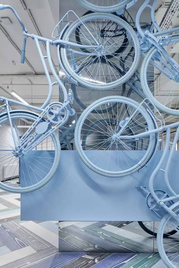 這種梯級的色彩配比猶如美麗的風(fēng)景畫一般令人賞心悅目,也再次點明本案的設(shè)計主題:運動、青春、以及浪漫主義的藝術(shù)情懷。接待臺旁邊那一組粉藍色自行車藝術(shù)裝置再次強化了這個設(shè)計主題。接待區(qū)的多元混搭組合設(shè)計,也在向大家傳遞這是一個多功能綜合型的辦公室屬性。