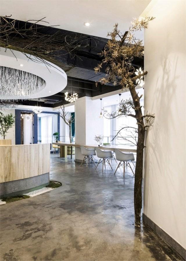 在材料的運(yùn)用上選用的都是一些環(huán)保低碳的天然材料,如樹枝、石竹、枯木、天然原木板,地面則是采用了水泥自流平的方式。