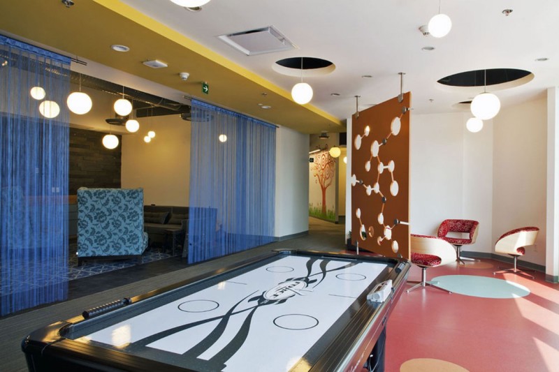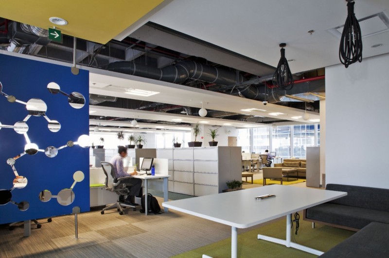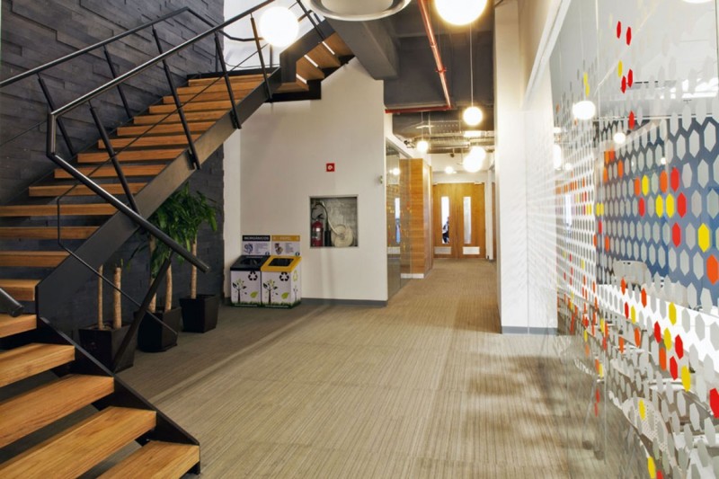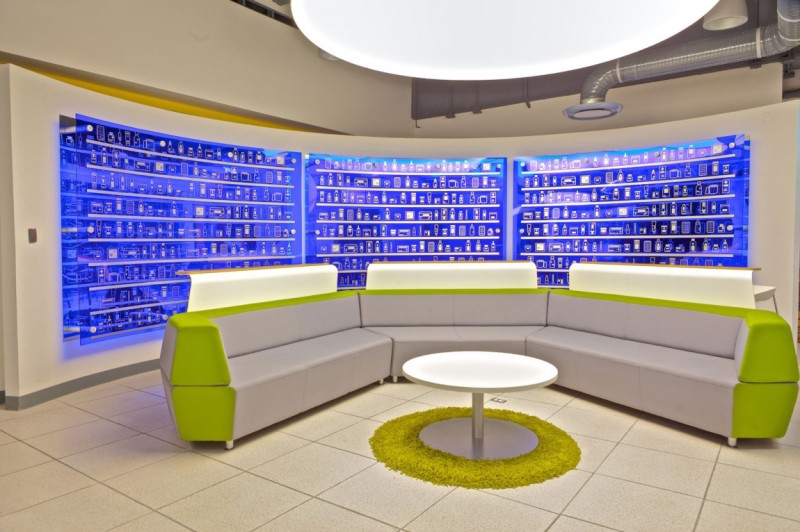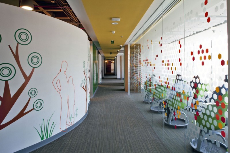 辦公空間的設(shè)計(jì)簡(jiǎn)約時(shí)尚而充滿(mǎn)童趣,走出電梯間便是一個(gè)圓形的開(kāi)敞式接待區(qū),接待區(qū)兩側(cè)是由兩個(gè)藍(lán)色玻璃組成的展示墻,玻璃上繪有興康藥品產(chǎn)品外形樣式,接待區(qū)的中間區(qū)域是以綠色植物為背景的接待臺(tái)。走廊兩側(cè)的墻壁上繪畫(huà)著抽象的圖案,圖像有著積極向上和強(qiáng)勁生命力的寓意,符合興康的企業(yè)文化。在工作區(qū)設(shè)計(jì)師打破了千篇一律的工作形式,營(yíng)造了一個(gè)輕松,寬敞,開(kāi)放,點(diǎn)綴著休閑元素的辦公環(huán)境,家具的高度被刻意的降低,目的是為了讓所有的工作人員都能享受自然光和戶(hù)外迷人的景色。