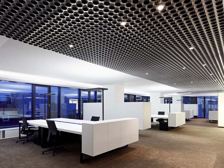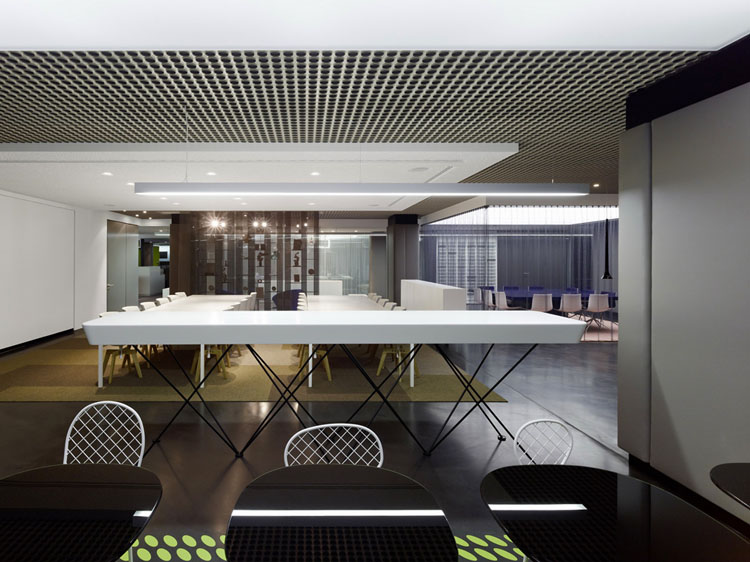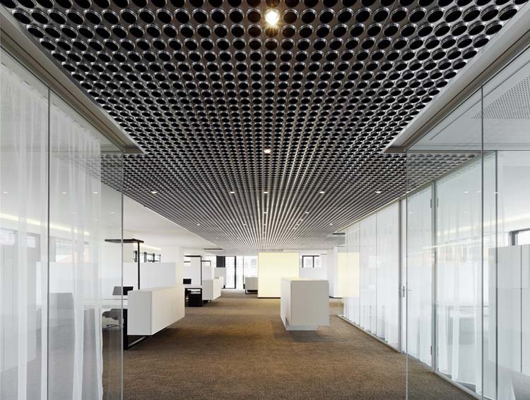 其概念是設(shè)置一個(gè)為所有部門共用的交流空間,以及滿足不同協(xié)作需要的不同分區(qū)。原先單獨(dú)、分散化的辦公室變成大型開放式的辦公空間,鼓勵(lì)同事之間的交流。每一個(gè)樓層都有單獨(dú)的辦公室和單獨(dú)的工作組空間,以及大型開放式工作間。各個(gè)工作站的工作人員能夠相互交流。玻璃立面的辦公室中,十字形的結(jié)構(gòu)將開放式的空間分隔為各個(gè)單元,但又是集中的工作環(huán)境。一系列暖色調(diào)的材料營造出不同的氣氛,有時(shí)候讓員工感覺到像在家里一樣。辦公樓中的地毯有著清晰的路徑指示和功能分區(qū)。就餐區(qū)地板上的綠點(diǎn)如同變魔術(shù)一樣變出草地的效果,構(gòu)筑起通向露臺(tái)的一道概念式的橋梁。向露臺(tái)打開的半圓形裝飾空間與其他部分區(qū)分開來,透明的蕾絲幕布構(gòu)成了半私密的空間,而清新的色彩、深藍(lán)色的桌子和粉色的地毯,無不為員工帶來激發(fā)工作情緒的氛圍。